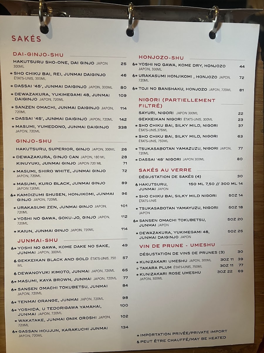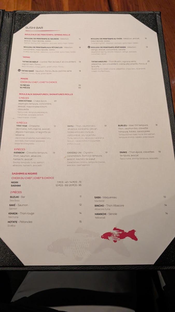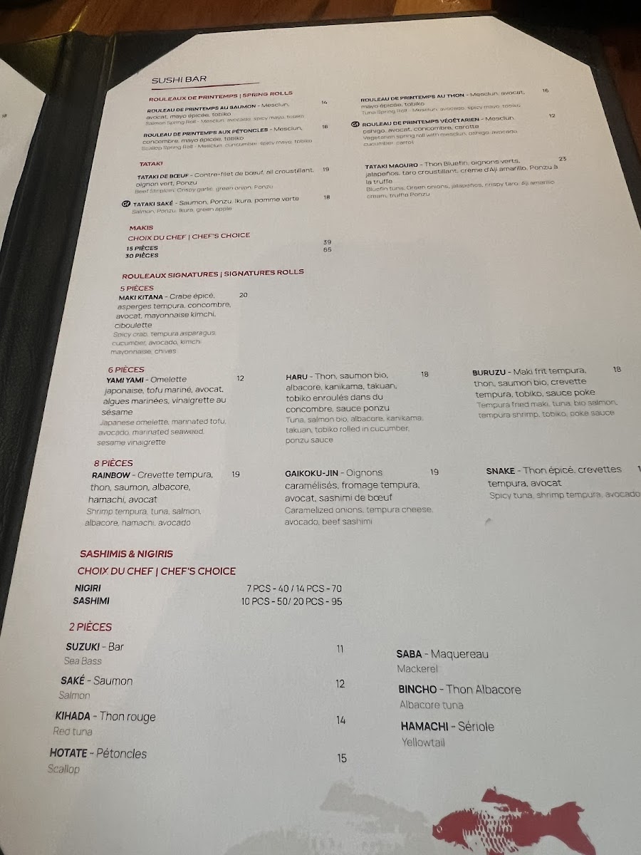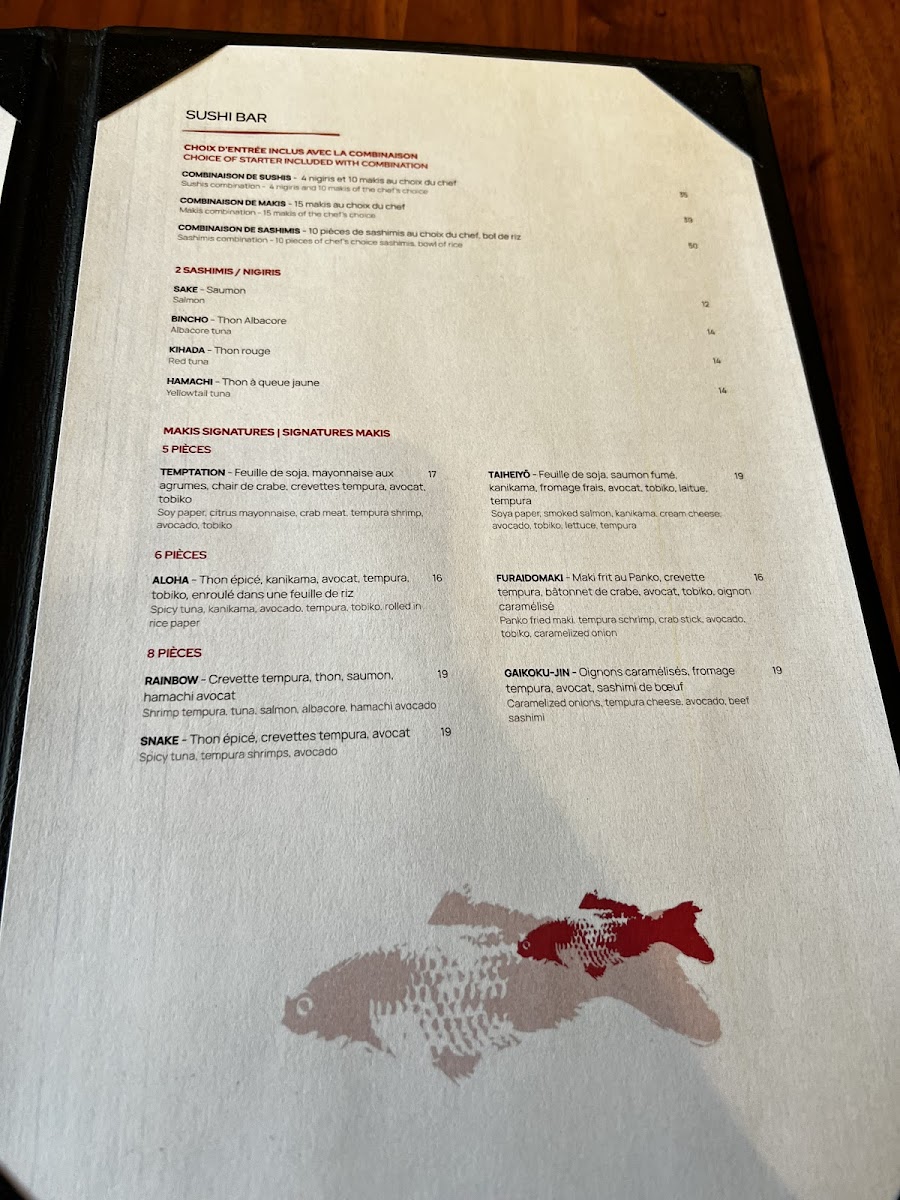 - Sushi Bar: This section includes chef-selected combinations such as maki assortments, nigiri and maki mixes, as well as sashimi plates served with rice. Individual sashimi items are available, featuring fish varieties like salmon (saké), albacore tuna (bincho), red tuna (kihada), yellowtail (hamachi), sea bass (suzuki), scallops (hotate), and mackerel (saba).